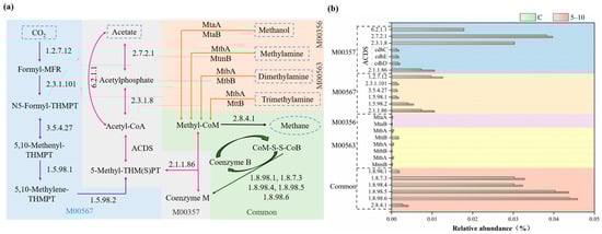 In the acetoclastic methanogenesis pathway, acetate is converted to acetyl-CoA through two pathways, as described in Section 3.4.1. Acetyl-CoA is subsequently converted to 5-methyl-tetrahydromethanopterin by acetyl-CoA decarbonylase/synthase (ACDS); the relative abundances of enzymes were upregulated in the 5–10 group. Afterwards, the methane was generated via tetrahydromethanopterin S-methyltransferase (EC: 2.1.1.86) and methyl-coenzyme M reductase (EC: 2.8.4.1). The relative abundance of EC: 2.1.1.86 and EC: 2.8.4.1 in the 5–10 group was upgraded by 42.74% and 48.69% respectively, compared to the C group. The byproduct coenzyme M-S-S-coenzyme B was converted into functional coenzyme M and coenzyme B through heterodisulfide reductases (EC: 1.8.7.3, EC: 1.8.98.1/98.4/98.5/98.6), and the relative abundance of heterodisulfide reductases was upregulated by 4.66%–15.23% in the 5–10 group. To summarize, the acetoclastic methanogenesis was enhanced.