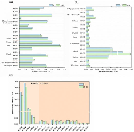 Figure 8a presents the relative abundance of genes encoding the enzymes that were essential for bacterial DNA replication. The double helix structure is unwound by helicase (K02314) during the initiation phase of DNA replication. The relative abundance of K02314 was 0.0442% and 0.0439% in the C and 5–10 groups, respectively. After the unwinding of the DNA, the association of single-strand binding proteins (SSB) and the exposed single-stranded DNA could prevent reannealing. The relative abundance of the SSB-encoding gene (K03111) in the 5–10 group was 2.98% higher than that in the C group. Furthermore, the primase (K02316) utilizes the single-stranded DNA template to generate RNA primers in the subsequent primer synthesis stage. The relative abundance of K02316 was 0.0506% in the 5–10 group and 0.0505% in the C group.