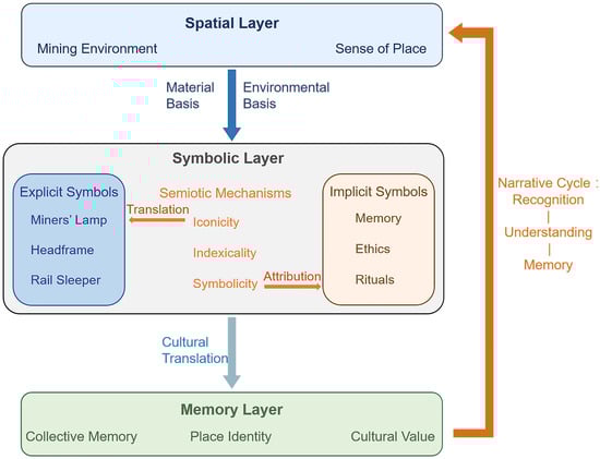 Spatial–Symbolic–Memory Narrative Framework for Abandoned Mines. Conceptual model of the spatial, symbolic, and memory layers in abandoned mine environments, illustrating how explicit and implicit symbols mediate the narrative cycle from recognition to understanding and memory.