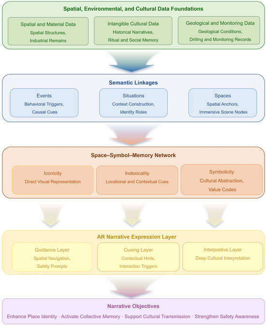 In the narrative practice of abandoned mines, AR constructs dynamic spatial semantics by integrating physical structures, digital symbols, and interactive pathways. Mine entrances serve as trigger nodes for historical events, while tunnels and work faces carry content such as production processes, accident records, and safety knowledge, enabling visitors to gradually establish connections among space, events, and memory during exploration [20]. Path organization based on interactive nodes frees narratives from a single linear sequence, allowing users to enter different narrative branches according to their interests, achieve differentiated experiences and personalized understanding, and at the same time maintain orientation and cognitive coherence. To further clarify the coupling of physical structures, digital symbols, and interactive pathways, the AR-supported spatial narrative mechanism can be abstracted into a systematic technical framework (Figure 2), visually presenting the overall process of data acquisition, semantic construction, and interactive delivery.