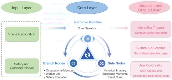 The interaction logic is organized around a non-linear narrative structure, in which storytelling pathways consist of both a main thread and multiple branches. The main thread focuses on key historical milestones such as mine construction, extraction, and closure, while the branches supplement safety culture, workers’ lived memories, and local customs. This approach preserves the continuous transmission of core information while increasing exploration freedom and supporting personalized experiences (Figure 5). To support the non-linear narrative structure, the system incorporates a context-aware triggering mechanism that monitors users’ position, orientation, and movement within the mine. When users approach specific spatial nodes or culturally significant relics, the system infers the corresponding narrative context and automatically activates related multimedia content, including animated process reconstructions, spatialized audio, and voice narration. This automatic triggering reduces unnecessary interaction steps and ensures a continuous and coherent narrative flow in constrained underground environments. This dynamic content scheduling strategy effectively reduces attention interruptions caused by manual selection and allows the narrative chain to unfold naturally.