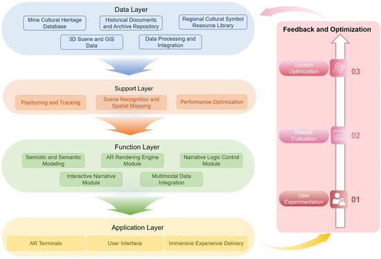By integrating the technical implementation with visual narrative strategies, the system achieves stable operation, effective visualization, and contextualized storytelling under complex underground conditions, establishing a solid foundation for subsequent user experiments. As shown in Figure 7, a comprehensive framework is constructed, consisting of a data layer, support layer, functional layer, and application layer, combined with a feedback loop of user testing–result evaluation–system optimization to enable dynamic improvement driven by user experience. This framework not only delineates the complete chain from cultural resource acquisition to immersive interactive output but also provides a structured foundation for future system expansion and refinement.