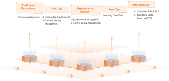 Workflow of the User Experiment. Experimental design and sampling procedure for evaluating AR-supported learning and cultural identity, including participant recruitment, grouping, assessment, and statistical analysis.