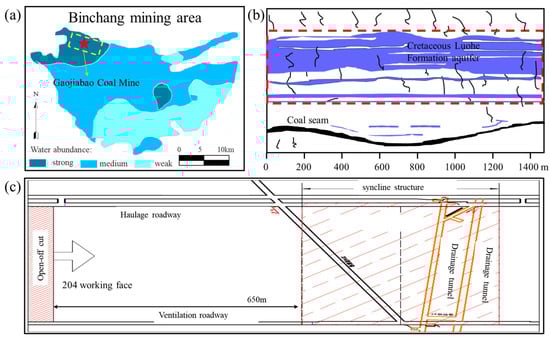 Brief introduction of study area: (a) The water enrichment of Luohe Formation in Gaojiapu Coal Mine; (b) Spatial relationship between coal seam and aquifer; (c) Layout plan of roadway in 204 working face.