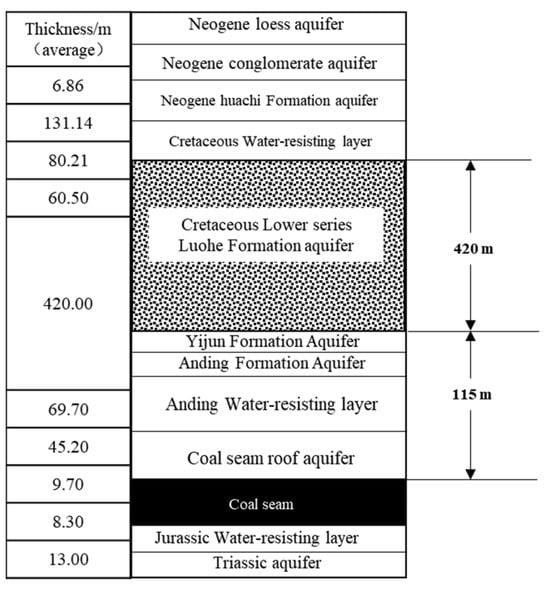 Figure 2 illustrates a borehole log for the 204 working face. During the mining process of the 204 working face, the primary water-bearing source in the roof is the sandstone aquifer within the Lower Cretaceous Luohe Formation, with a thickness ranging from approximately 320 to 420 m. The vertical distance between the coal seam and this aquifer is approximately 115 m. When the working face mining reaches approximately 400 m, the maximum roof water inflow exceeds 1100 m3/h, significantly disrupting normal mining operations at the working face.