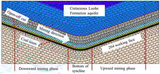 Gaojiapu Coal Mine is located in the northwest of the Binchang Mining Area, where the surface predominantly features ridge and tableland landforms, with the northern and eastern margins adjacent to the Jinghe River valley. The mine has a designed annual production capacity of 5 million tons, and the primary coal seam targeted for extraction is the No. 4 coal seam of the Middle Jurassic Yan’an Formation, which has an average thickness of 9.7 m. Overlying this seam is a thick confined aquifer within the Cretaceous Luohe Formation, reaching a maximum thickness of 580 m. The upper section of the Luohe Formation consists of thick, coarse-grained sandstone, with an average porosity of 15.44% and a permeability coefficient ranging from 0.2 to 1.55 m/day. This aquifer is highly water-rich, exhibits substantial water yield, and is characterized by pore pressure of up to 7.0 MPa. As shown in Figure 1, the 204 working face has a length of 200 m and an average coal seam thickness of approximately 10.6 m. It employs the fully mechanized longwall caving method, with a shearer cutting height of 3.75 m and a caved coal height of about 6 m. During mining operations, roof strata are managed through natural caving. Water inflow from the working face is discharged by gravity into the sump at the bottom of the shaft. A synclinal structure exists along its strike, with the syncline axis located 650 m from the initial mining open-off cut. As the working face advances, it sequentially undergoes distinct mining phases: downward-dipping mining and upward-dipping mining. The dip angles of the synclinal structures are uniformly 17°.