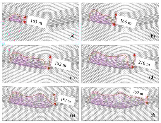 The variation law of the WCFZ with mining distance: (a) 150 m; (b) 350 m; (c) 550 m; (d) 650 m; (e) 800 m; (f) 1000 m. Note: The colored section represents the failure state in the UDEC model, where magenta indicates shear failure and green indicates tensile failure.