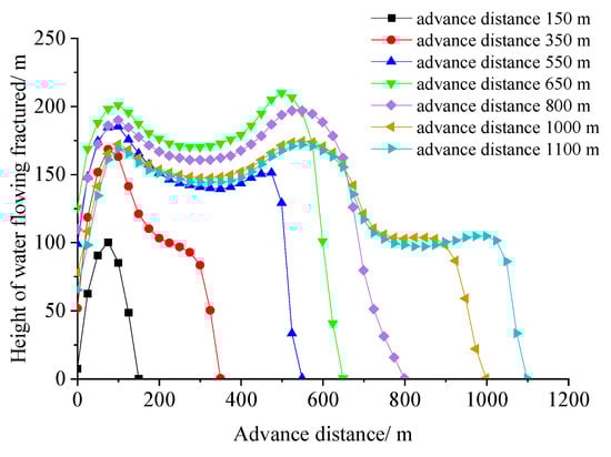 The mining speed of the 204 working face on site is approximately 3 m/d. Figure 5 and Figure 6 show the development characteristics of the roof plastic zone and WCFZ during the mining process. It can be observed that from the open-off cut position to the bottom of the syncline axis, the maximum development height of the WCFZ increased from 103 m to 182 m (see Figure 5a–c). This indicates that a continuous water inflow pathway is established and persists between the coal seam roof and the Luohe Formation aquifer once the working face advances beyond 350 m, as the WCFZ height exceeds the protective layer thickness 115 m. After the working face passes through the bottom of the syncline axis into the upward-dipping mining stage, the maximum development height of the WCFZ exhibits an initial increase followed by a gradual decrease. Specifically, when the working face has advanced 650 m from the cutting opening, the WCFZ reaches its maximum height of 210 m (see Figure 5d). Subsequently, with increasing advancing distance, the WCFZ height gradually decreases and stabilizes at approximately 150 m. Field measurements indicated that when the working face reached the syncline axis area (approximately 650 m), the maximum height of the WCFZ was approximately 205 m. This measured value is in close agreement with the simulated result of 210 m at the same location, yielding a relative error of less than 2.5%. Overall, during the downward-dipping mining phase, the maximum height of WCFZ development increases progressively with advancing distance and reaches its peak near the syncline axis area. This suggests higher stress concentration in this region, leading to more intense fracturing and failure of the overlying strata. Upon transitioning into the upward-dipping mining phase, the WCFZ height gradually decreases and eventually stabilizes. This reduction is attributed to the compaction of mining-induced fractures under stress concentration caused by the load from fractured overburden strata. These findings indicate that a continuous water inflow pathway persisted between the coal seam roof and the Luohe Formation aquifer throughout the entire face withdrawal process, resulting in sustained exposure of mining operations to significant roof water inflow over the whole withdrawal period.