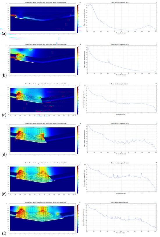 When mining reached 350 m, the mining-induced fractures had extended into the aquifer of the Luohe Formation. At this stage, the roof water inflow consisted of both water from the immediate roof sandstone and water from the sandstone aquifer in the Luohe Formation. By performing line integration of the flow flux at each point along the goaf roof and abutments up to the 350 m mining position, the total water inflow into the working face was calculated as 446 m3/h. Similarly, the water inflow values were determined to be 960 m3/h, 1120 m3/h, 1065 m3/h, and 830 m3/h at advancing distances of 550 m, 650 m, 800 m, and 1000 m, respectively. Based on the comprehensive numerical simulation results, it is evident that the roof water inflow volume in the syncline structural area reaches its maximum near the axis trough. As mining advances upward, the roof fractures gradually close, and water inflow stabilizes.