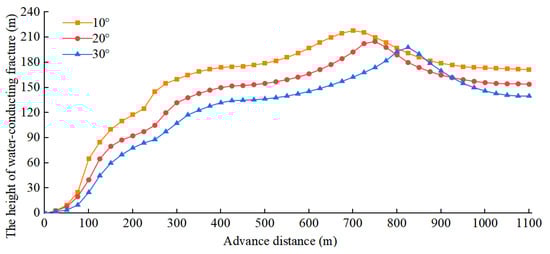 Using the UDEC model established in Section 2.2, the influence of different syncline structural angles on the development of the WCFZ in the working face was investigated. In the simulation setup, the mining height was set at 10 m and the mining speed maintained at a constant 3 m/d, with syncline structural angles defined as 10°, 20°, and 30°, respectively. The response relationship between the development height of the WCFZ and the syncline structural inclination throughout the entire mining process is illustrated in Figure 9, revealing a negative correlation between the two variables. During the downward-dipping mining phase, the maximum development height of the WCFZ decreases as the syncline structural inclination increases, with corresponding values of 175 m, 152 m, and 135 m under the three inclination conditions. Upon entering the axis trough region, the growth rate of the WCFZ slows down and gradually stabilizes. At the onset of upward-dipping mining, the maximum development height under the 30° inclination condition is slightly higher than that under the other two conditions, after which it progressively declines. By the end of the recovery process, the final heights of the WCFZ are 172 m, 154 m, and 140 m for the respective inclination scenarios.