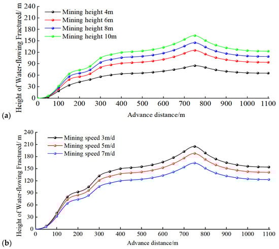 Variation by mining speed and mining height: (a) the height of WCFZ; (b) Inflow in roof of working face.