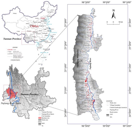 The Nu River-Salween, an international river traversing China and Myanmar, originates from the Tibetan Plateau and discharges into the Andaman Sea. Within this transboundary basin, the dry-hot valley of LJD constitutes the largest such geomorphological unit in the mid-reaches of the Nu River Basin (Figure 1). Bordered by the Gaoligong Mountains to the west and the Nu Mountains to the east, this 1308.88 km2 valley features parallel north–south mountain ranges and river systems, administratively encompassing Lujiang Town and Mangkuan Yi-Dai Ethnic Township with jurisdiction over 41 villages. Renowned for its ecological complexity and ethnic diversity, the area sustains unique vertical gradient microclimates and preserves the cultural heritage of Nu, Lisu, and Dai ethnic communities [37]. China’s rural revitalization initiatives, particularly Yunnan Province’s “Greater Western Yunnan Tourism Loop” development strategy, have catalyzed unprecedented tourism growth while intensifying pressures on fragile ecosystems and cultural landscapes [38]. Current research on heritage site threats predominantly addresses either environmental or anthropogenic factors [39], yet the compounding impacts of unregulated tourism infrastructure expansion remain understudied. Without systematic spatial planning integrating ecological and cultural preservation, escalating development may irreversibly degrade both natural capital and socioeconomic sustainability. As a critical ecotone exhibiting concentrated ethnic settlements, altitudinal biodiversity, and evolving development tensions, the LJD serves as an exemplary microcosm for examining sustainable tourism paradigms in China’s mountainous frontiers.