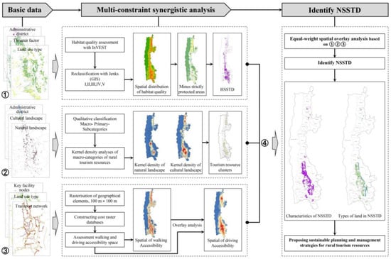 Rural tourism functions as a complex adaptive system where synergistic interactions and cascading effects coexist among ecological, resource, and infrastructural subsystems [3]. Achieving equilibrium within this system necessitates a holistic analytical approach. To this end, this study establishes a tri-constraint synergistic framework integrating habitat quality, resource endowment, and facility accessibility (Figure 2), where “constraints” denote critical systems that regulate rural tourism development potential through both limitation and optimization mechanisms. The habitat quality constraint operationalizes ecosystem service theories and habitat suitability modeling. The resource endowment constraint quantifies the spatial clustering of competitive assets that natural landscapes and cultural heritage drive regional tourism appeal [40]. Facility accessibility constraints derive from knowledge contributions such as spatial equity and gravity modeling [36], emphasizing the impact of infrastructure on the efficiency of rural tourism resource utilization, as well as the cost of tourist experience and the ease of community participation. Methodologically, interdisciplinary synthesis and complexity theory frameworks offer robust analytical paradigms, enabling the deconstruction of nonlinear dynamics and emergent interactions among evolving system components [41], provide methodological foundations for multi-constraint synergistic assessments that enhance resource utilization efficiency, system adaptability, and innovation capacity [27]. This theoretical basis allows us to decode the spatial allocation mechanisms through the following phases: