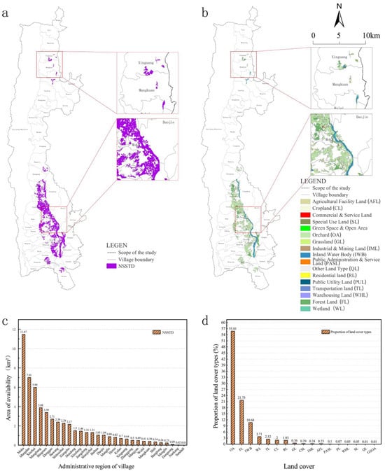 Spatial Characteristics of the NSSTD: (a) the NSSTD spatial patterns; (b) Land cover types in the NSSTD; (c) the NSSTD per village; (d) Land cover differences.