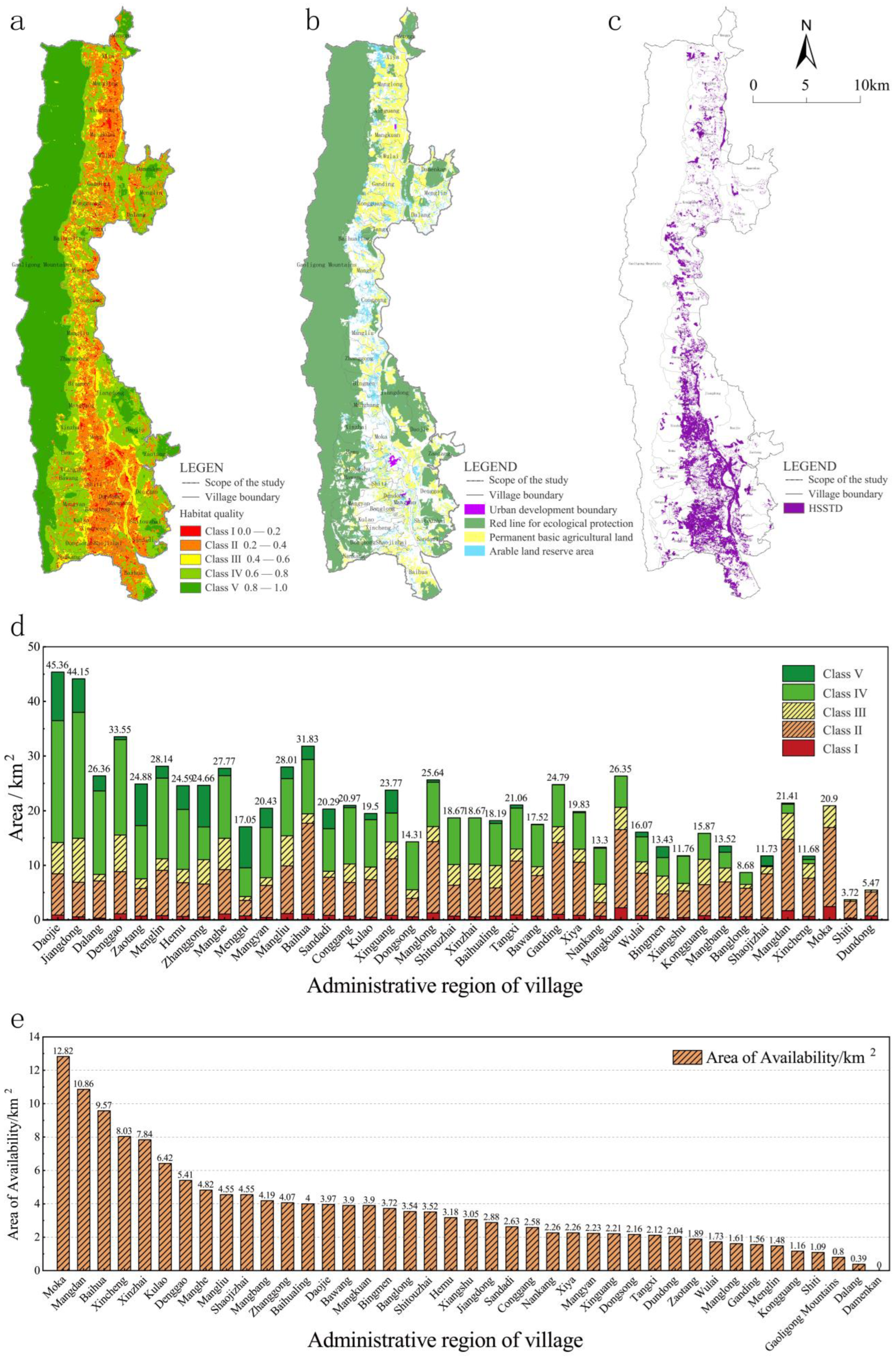 | Land Use Type | Habitat Quality Score | Croplands | Orchards | Urban Zones | Rural Settlements | Other Construction Sites | Bare Lands |