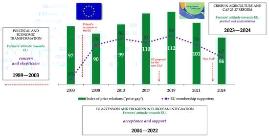 During the period of systemic transformation in Poland, the focus of economic and political reform was mainly on integrating with the EU. This integration aimed to link the national economy with the common European market, provide access to structural funds, improve public institutions by incorporating them into EU structures, and enable participation in EU policies. These efforts were met with high expectations and hopes from the political elite and wider society in Poland. However, there were also fears and distrust concerning integration with the EU. One group that particularly opposed Poland’s EU membership was farmers and rural residents, who generally held pessimistic and skeptical views about public institutions [34]. Prior to joining the EU, only 23% to 45% of farmers supported Poland’s membership in the EU, largely due to concerns about farm bankruptcies, land acquisition by foreigners, challenges in selling agricultural products, as well as increased poverty and unemployment (Figure 1) [35].