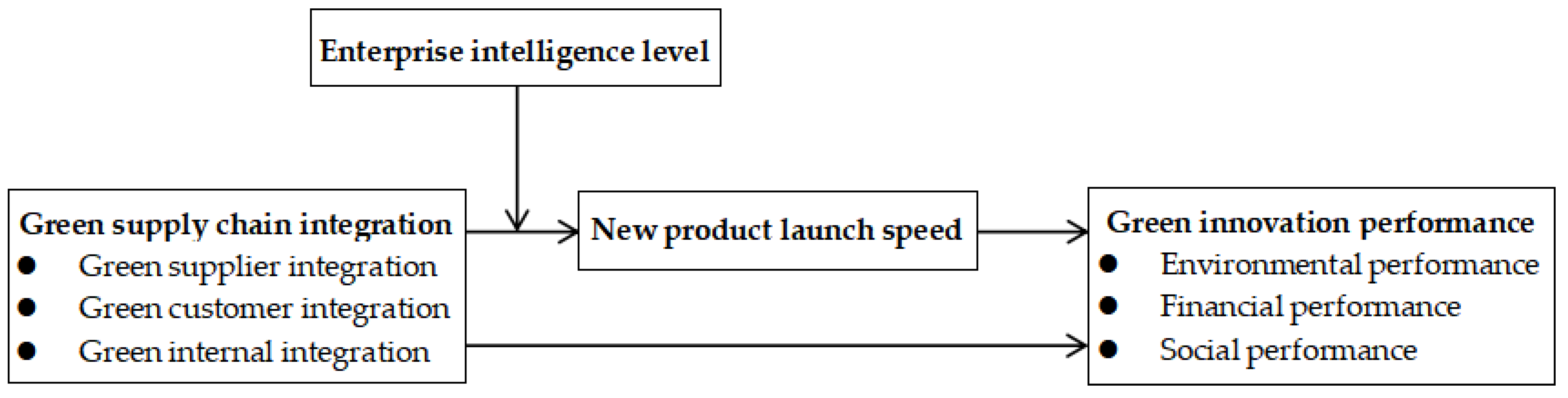 Yang, F.; Chen, J.; Song, Y.; Hu, J.; Zhang, H.; Shao, Y. Green Supply Chain Integration, New Product Launch Speed, and Green Innovation Performance: The Moderating Role of Enterprise Intelligence Level. Sustainability 2025, 17, 10967. https://doi.org/10.3390/su172410967