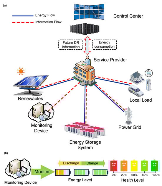 (a) Microgrid energy management model. (b) A monitoring device for battery health.