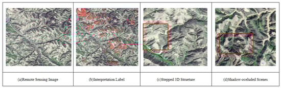 The first category exhibits distinct morphological characteristics, featuring pronounced three-dimensional terraced structures with clearly defined strip-like features (Figure 3c). The second category is embedded within valleys, showing significant shadow occlusion and indistinct boundaries (Figure 3d).