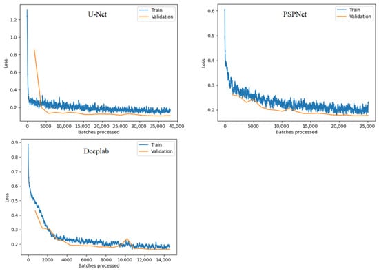 The training loss curves (blue represents training set loss, orange represents validation set loss) allow us to compare the training processes and performance differences among U-Net, PSPNet, and DeepLabV3 as follows (Figure 5). DeepLabV3 converges most rapidly among the three models, with training loss dropping below 0.2 after approximately 2000 batches and validation loss converging simultaneously. This demonstrates its superior fitting efficiency for the Qinba Mountain terraced field dataset. U-Net’s training loss stabilizes around 5000 batches, converging slower than DeepLabV3+ but faster than PSPNet. PSPNet exhibited the slowest convergence, with loss values only gradually stabilizing after 5000 batches. Notably, its training loss remained below validation loss, indicating significant overfitting. Consequently, its generalization capability was relatively weak, demonstrating insufficient adaptation to the complex features of the Qinba Mountain terraced field dataset.