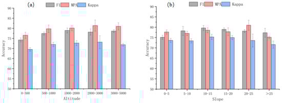 F1, Kappa, MPA of terrace class for (a) different elevations and (b) different slopes.