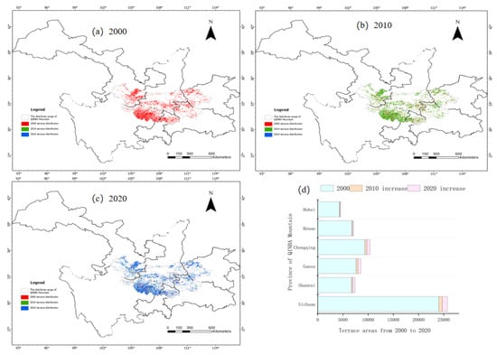 Distribution Patterns and Changes of Terraced Fields in the Qinba Mountains from 2000 to 2020. (a–c) Distribution patterns of terraced fields in the Qinba Mountains from 2000 to 2020. (d) Changes in the distribution of terraced fields across provinces in the Qinba Mountains from 2000 to 2020.