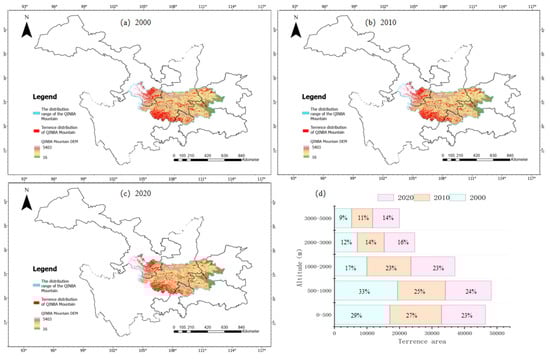 Distribution area of terraced fields in the Qinba Mountains at different elevations from 2000 to 2020. (a–c) Elevation distribution patterns of terraced fields in the Qinba Mountains from 2000 to 2020. (d) Changes in elevation distribution of terraced fields in the Qinba Mountains from 2000 to 2020.
