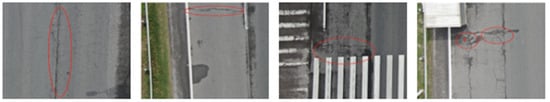 To address the lack of high-resolution UAV-based crack datasets that reflect realistic road surface conditions in Chinese urban road environments, we constructed a new dataset named LCrack. Existing public datasets such as RDD2022 mainly focus on vehicle-mounted or ground-level perspectives, with limited support for low-altitude UAV imagery and insufficient representation of fine-grained crack morphology. Therefore, a custom dataset was required to enable accurate detection in real-world UAV inspection scenarios. The dataset was collected using a DJI Mini 4 UAV in Linyi, China, during March 2025, on a clear and calm afternoon with stable lighting conditions. Images were captured at the highest available resolution supported by the device under a vertical top-down perspective from an altitude of 3–6 m. Representative UAV collection views and crack samples are provided in Figure 1.