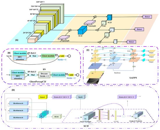 Architecture of the proposed CrackLite-Net. (A) Overall architecture. (B) Architecture of GhostPercepC2f. (C) Architecture of SAFPN. (D) Architecture of SC2f. Abbreviations: U = Upsample; D = Downsample; C = Concat; S = SimAM. * Indicates feature weighting.