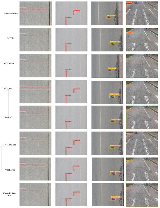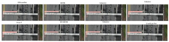 Figure 3 presents qualitative examples of longitudinal crack detection using different models on the LCrack dataset. It can be observed that EfficientDet, DETR, YOLO10, and YOLO11 exhibit weak responses to crack boundaries and are prone to missed detections or partial structural loss under challenging conditions such as uneven illumination, pavement abrasion, and strong background texture interference. Swin-T and RT-DETR show improved performance compared to the former models, achieving more reliable recognition of the main crack region; however, they still struggle to capture the full extent of long and slender crack structures.