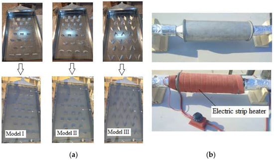 SAC Models: The collector body is designed and fabricated from aluminum and measures 990 × 1640 × 100 mm. Three barrier models were fabricated and tested (flat, trapezoidal, and V-groove). All models were filled with 25 barriers. The barrier dimensions in Model I were 10 cm × 4 cm, arranged in parallel rows. In comparison, Model II had an arc length of 10 cm and a height of 4 cm. Finally, Model III was filled with 25 V-groove barriers, and a group of equal-sided triangles forms the V-shaped geometry. The 25 barriers were formed from 200 × 40 × 2 mm aluminum strips bent in half to create two sides of an equilateral triangle at a 60-degree angle. These barriers were fixed in parallel rows to the solar collector channel, as shown in Figure 1a. The collector has an open bottom for inlet air and a circular outlet on the upper side with a 75 mm diameter. The aluminum absorber is 0.7 mm thick. In this arrangement, air enters through the bottom channel between the absorber plate and the glass. The detailed specifications of the solar air collectors selected for the experiments are given in Table 1.