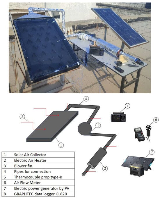 The experimental work was conducted on a clear, sunny day from 7:00 AM to 7:00 PM at the University of Technology in Iraq, located at 33.3123° N, 44.446° E. The experimental arrangement is illustrated in Figure 2. The system consists of four important parts: the solar air collector, the electric air heater, the electric power generator from solar cells, and the axial air impeller (blower fan). The specifications of the solar air collector and electric air heater are provided in Table 1. The solar heating system is equipped with an axial blower fan at the outlet of the SAC. The blower fan draws air in such a way that it circulates the air within the system as needed, and the voltage regulator controls its speed (air mass flow rate). The fan characteristics were an HF-100 model, 35 W, 2600 RPM, and 220 m3/h flow. A solar-powered generator provided the electrical energy needed to heat the air to the required temperature.