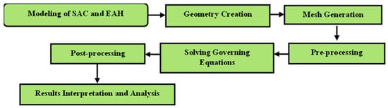 The computational analysis is based on the fundamental governing equations of fluid dynamics, which include the conservation of mass (continuity), momentum (Navier–Stokes), and energy. These equations were adapted for a three-dimensional, steady-state, incompressible, and viscous fluid flow regime to represent the physical behavior within the system accurately. Numerical solutions were obtained using the COMSOL commercial CFD software Version 6.1 (v6.1), employing a finite volume approach. The simulation setup and solver parameters were configured following established practices and prior studies, as referenced in [18,21]. This approach enables the precise evaluation of heat transfer, fluid motion, and thermal energy storage performance within the solar collector and EAH models. This analysis depends on many assumptions: