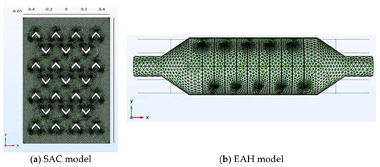 A computational fluid dynamics model was used to simulate heat transfer by absorption through the absorbent plate, which was loaded with airflow-blocking barriers. Unstructured tetrahedral meshes were used to model the air domain. An irregular tetrahedral mesh was adopted due to the model’s complex geometry. A finite-volume method is adopted here, in which the domain of interest is divided into smaller geometric elements. The mesh accommodates tetrahedral elements in 3D. Consideration was also given to eliminating the effect of mesh size by creating an independent solution. The optimal mesh size was chosen because increasing the mesh parameter size did not affect the results. Figure 5 shows the 3D meshed geometry of the models for the solar heating system. The final mesh model produced accurate results in numerical simulations, which are more suitable for comparing heat gain within the collector and for identifying the working fluid velocity and temperature distribution. Finally, the fine-mesh model was used for simulations and analysis.