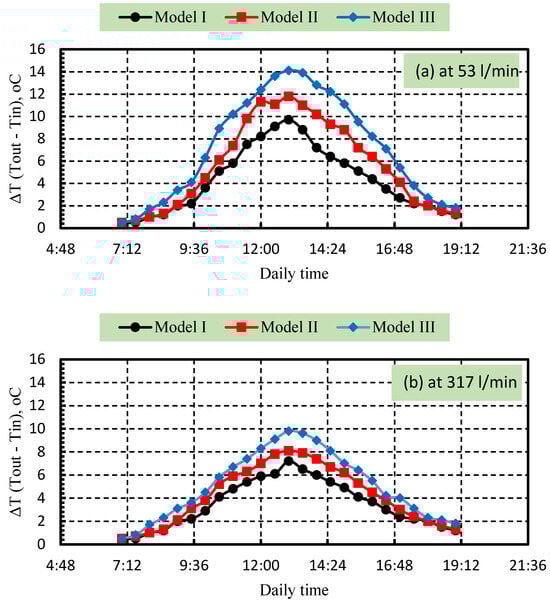 Figure 7 shows the effect of different SAC models on the diurnal variation in air temperature difference (ΔT = Tout − Tin) at air flow rates of 53 and 317 L/min. It compares three models: Model I, Model II, and Model III. The findings indicate that Model III demonstrates superior thermal performance, likely due to a more favorable V-groove shape and thermal absorption period. Model I (flat shape) performs the worst, indicating lower thermal absorption or less optimal structural properties. All models exhibit a similar diurnal pattern: ΔT increases gradually during the morning, peaks around noon to early afternoon (12:00–14:00), and then declines toward the evening. At a flow rate of 53 L/min (Figure 7a), Model III consistently shows the highest ΔT across the entire time span, reaching a peak of approximately 14.1 °C. Model II follows closely with a slightly lower peak (~11.8 °C). Model I delivers the lowest ΔT throughout the day, peaking just below 9.7 °C. At a flow rate of 317 L/min (Figure 7b), the behavior remains consistent, recording lower ranges for the highest ΔT of 9.8 °C, 8.1 °C, and 7.2 °C for Models III, II, and I, respectively. Generally, the role of the V-groove barriers was to increase flow disturbances, enhance turbulence intensity, and promote more vigorous mixing of the air stream. These effects collectively reduce the thickness of the thermal boundary layer along the absorber surface, allowing more efficient convective heat transfer. Consequently, the higher turbulence and improved thermal interaction led to increased absorber plate temperature, greater energy extraction, and higher system efficiency.