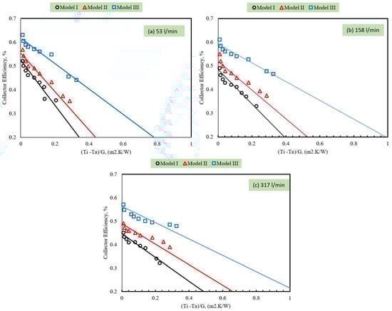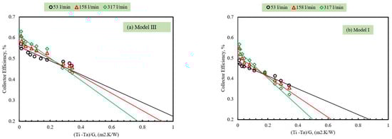 Figure 10 compares the thermal efficiency of two barrier types, (a) Model III (V-groove) and (b) Model I (flat), at three water flow rates. The data clearly show that collector efficiency declines as the (Ti-Ta)/G parameter increases, consistent with classical thermal-loss theory in solar collector analysis. Furthermore, Model III outperforms Model I at all flow rates due to the barrier’s shape, higher thermal absorption, and longer heat transfer period. Lower air flow rates (53 L/min) consistently deliver better thermal performance because the air has more time to absorb heat from the heated barriers. Model III (Figure 10a) exhibits the highest efficiency values at 53 L/min, which gradually decrease as the temperature parameter increases. As the flow rate increases to 158 and 317 L/min, efficiency curves shift downward. The collector operates more efficiently at lower flow rates, confirming that a longer air residence time in the V-groove barriers enables greater heat gain. Model I (Figure 10b) exhibited similar decreasing trends with increasing (Ti-Ta)/G. Overall efficiency values are lower than those for Model III at all flow rates. The difference between the curves (53, 158, and 317 L/min) is more pronounced, suggesting that the shape of heated barriers makes it more sensitive to flow rate variation.