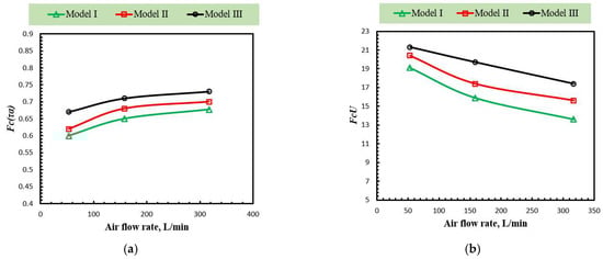 The variation in the collector efficiency characteristics with air flow rates: (a) Fc (τα) and (b) FcU.