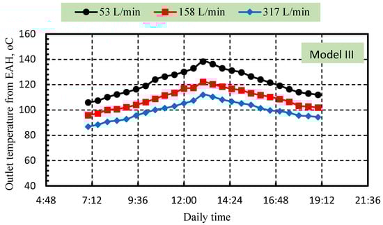 Variation in outlet air temperature from EAH with daily time for an open system with airflow rates of 53, 158, and 317 L/min, integrated with Model III.