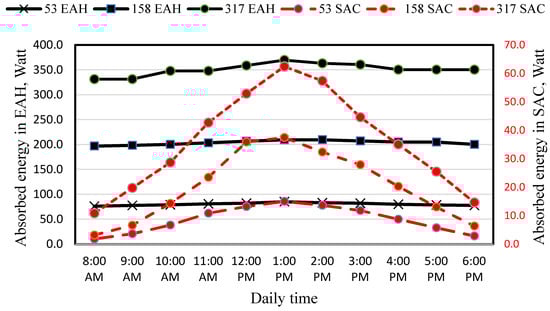 Variation in absorbed energy in SAC and EAH with daily time for airflow rates of 53, 158, and 317 L/min.