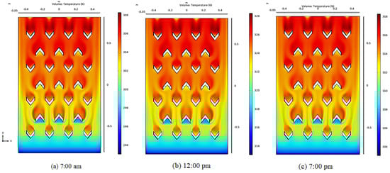 Figure 14 shows the contours of temperature distribution of the Model III collector for a flow rate of 53 L/min (a) at 7 a.m., (b) at 12 p.m., and (c) at 7 p.m. The results show that when air absorbs heat into the collector, the temperatures decrease. Still, at the exit, the air temperature increased due to suction and heat absorption within the V-groove design shown in the figure. It was noticed that the contour temperature rose as it approached the top.