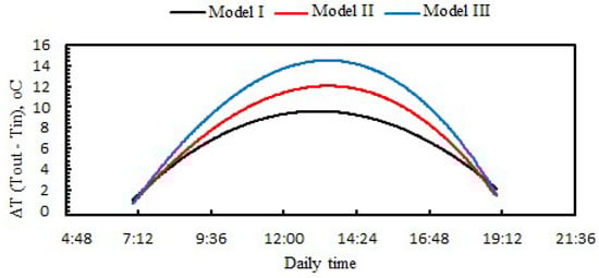Figure 15 shows the relationship between (∆T) and time during the day. The numerical program shows that, when cooling with air and using different models, the highest difference occurs at the V-groove barriers at an air flow rate of 53 L/min. Numerical results showed that the difference between inlet and outlet temperatures decreases across the remaining models, with reduced percentages of 11.8% and 12.7% for Model II and Model I, respectively.
