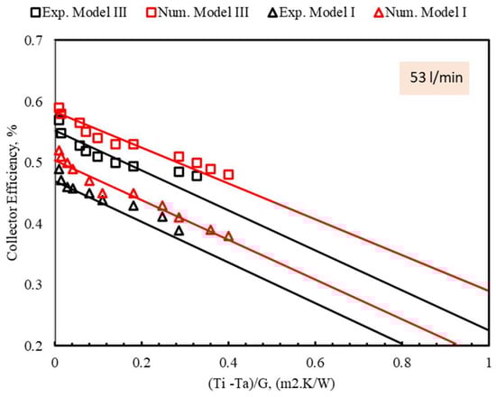 The validation results from Figure 17 strongly support the accuracy and reliability of the developed numerical models for both the SFC and EAH components. Depending on the Root Mean Square Error (RMSE), the maximum deviations between numerical and experimental results ranged from 7.7% to 8.4%, within acceptable engineering error margins. Figure 17 plots the SAC efficiency as a function of the reduced temperature parameter (Ti-Ta)/G for both Model III and Model I at a flow rate of 53 L/min. The experimental and numerical results follow the same trend, showing a decrease in efficiency with increasing reduced temperature, as expected, due to greater heat losses at higher temperature differentials. Model III’s maximum deviation between experimental and numerical efficiency values is 5.6%. For Model I, the maximum deviation is 4.8%. These differences are within acceptable limits for engineering simulations, validating that the numerical model reliably captures the thermal behavior of both barrier configurations under varying operating conditions.