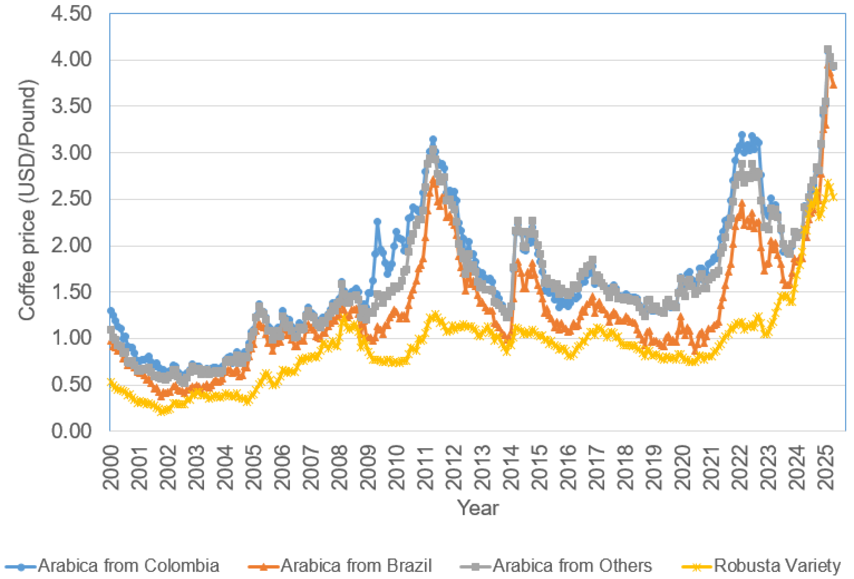 - FNC Estadísticas Cafeteras. Available online: https://federaciondecafeteros.org/wp/estadisticas-cafeteras/ (accessed on 23 April 2025).