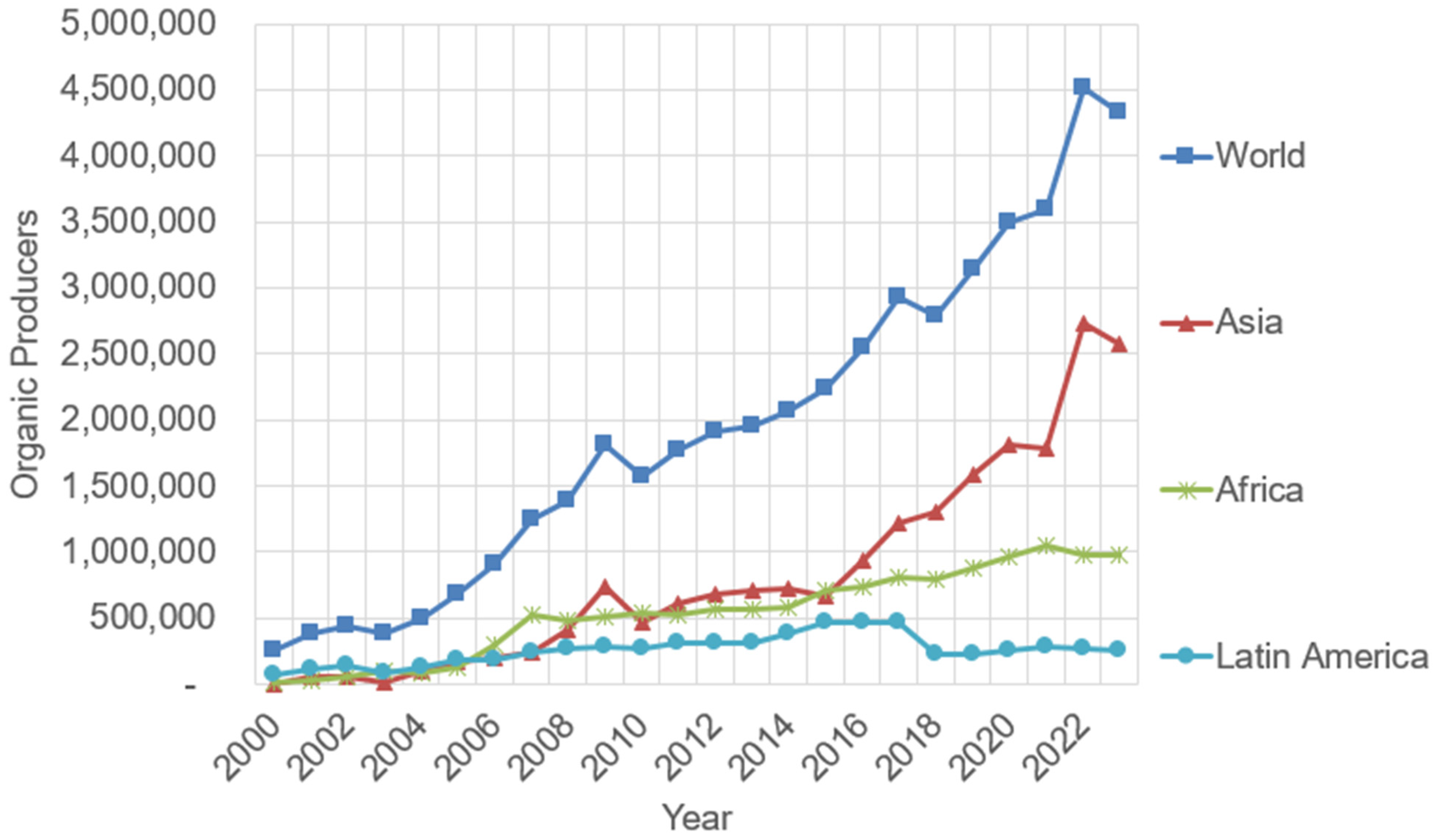 - FiBL. FiBL Statistics—Key Indicators. Available online: https://statistics.fibl.org/world/key-indicators.html (accessed on 5 May 2025).