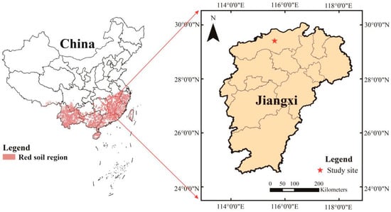 The experimental site is located in Jiangxi Soil and Water Conservation Ecological Science and Technology Experimental Station (115°42′38″~115°43′06″ E, 29°16′37″~29°17′40″ N) in De’an County, northern Jiangxi Province [34] (See Figure 1). The experimental site has a subtropical humid monsoon climate, with annual average precipitation of 1399 mm. The annual average temperature is 16.7 °C, and the highest monthly temperature occurs in July, while the lowest occurs in January. The annual average sunshine duration is 1650–2100 h, and the annual average frost-free period is 249 d. The rainy season occurs from April to September, during which >70% of the total rainfall occurs. The soil is red soil developed from quaternary red clay, and the soil pH is acidic to slightly acidic. The thickness of the local soil layer is approximately 105 cm. Below 105 cm, it is usually the base layer or a weakly permeable layer.