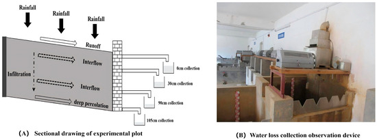 At the bottom of the slope in the residential area, a total of 4 out-flow outlets are set from top to bottom to collect runoff and sediment. They are the 0 cm runoff outlet, the 30 cm and 60 cm interflow outlets, and the 105 cm deep percolation outlet (see Figure 3A). At the bottom of each outlet, there are grooves to enable the different layers of soil infiltration flow to be intercepted and converge to the out-flow outlet. The out-flow collection ponds were equipped with automatic recording water level meters to monitor the dynamic processes of runoff and drainage in real time. The surrounding area and the base plate of the test device are cast with reinforced concrete. A gravel filter layer is set on the floor. A trapezoidal reinforced concrete retaining wall is built at the foot of the slope, which is 30 cm higher than the ground surface to prevent water from entering or exiting the community, thereby forming a closed drainage soil infiltration device. The runoff volume is calculated based on the water level readings on the pool walls; the flow in different soil layers is read from the self-recording water level meters (see Figure 3B). After the runoff generation process is completed, samples are taken from the pool, and the N contents of various forms are analyzed. Among them, TN is determined using the alkaline potassium persulfate digestion-ultraviolet spectrophotometry method; NH4+-N is determined using the sodium salicylate spectrophotometry method; NO3−-N is determined using the sulfuric hydrazine reduction method; and ON is TN minus NH4+-N and NO3−-N. In addition, an automatic meteorological station is set up next to the plots to observe meteorological variables such as precipitation, temperature, and sunshine according to the requirements of national meteorological stations. We observed rainfall, surface runoff, interflow, and deep percolation of 7 typical rainfall events for two years (2016 and 2017).