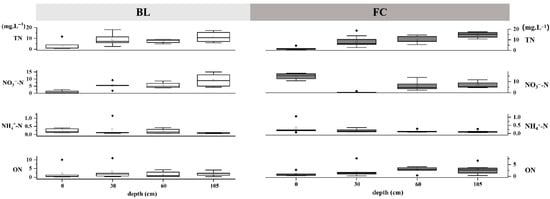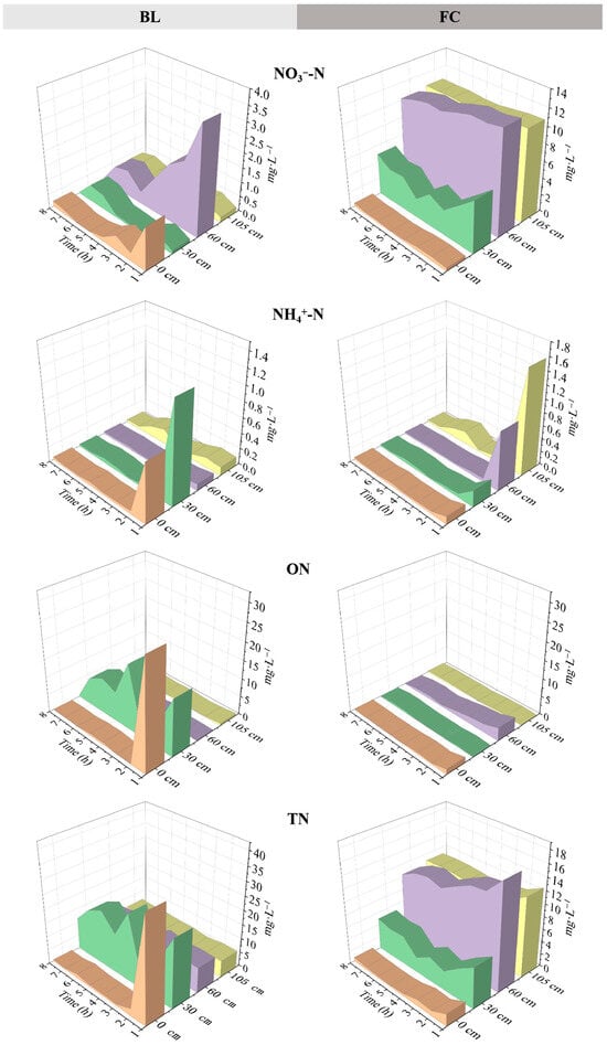 - In both BL and FC treatments, the ranking of different forms of N concentrations of each layer was NO3−-N > ON > NH4+-N, and the concentration of each form of N showed a trend of deep percolation > interflow > runoff. Compared with BL, TN and NO3−-N concentrations under the FC treatment in deep percolation were significantly higher.