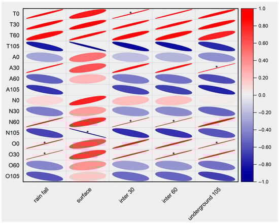 Correlation analysis between runoff and N transport. Explanatory note: The red ellipse represents a positive correlation, while the blue ellipse represents a negative correlation, and the darker the color, the larger the absolute value of the correlation coefficient. * indicates that there is a significant correlation between two factors (p < 0.05). T0, T30, T60, and T105 represent the concentrations of TN of runoff, interflow (30 cm), interflow (60 cm), and deep percolation, respectively. A0, A30, A60, and A105 represent the concentrations of NH4+-N of runoff, interflow (30 cm), interflow (60 cm), and deep percolation, respectively. N0, N30, N60, and N105 represent the concentrations of NO3−-N of runoff, interflow (30 cm), interflow (60 cm), and deep percolation, respectively. O0, O30, O60, and O105 represent the concentrations of ON of runoff, interflow (30 cm), interflow (60 cm), and deep percolation, respectively.