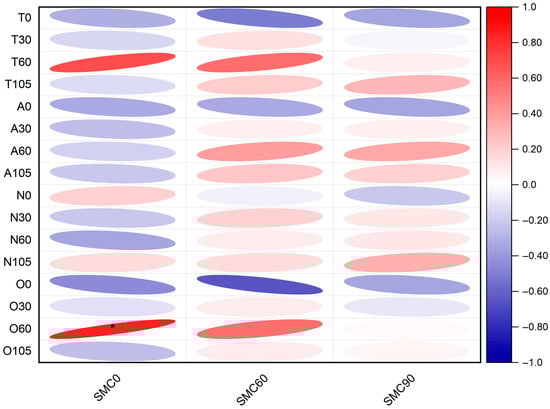 Correlation analysis between SMC and N transport. Explanatory note: The red ellipse represents positive correlation, while the blue ellipse represents negative correlation, and the darker the color, the larger the absolute value of the correlation coefficient. * indicates that there is a significant correlation between two factors (p < 0.05). T0, T30, T60, and T105 represent the concentrations of TN of runoff, interflow (30 cm), interflow (60 cm), and deep percolation, respectively. A0, A30, A60, and A105 represent the concentrations of NH4+-N of runoff, interflow (30 cm), interflow (60 cm), and deep percolation, respectively. N0, N30, N60, and N105 represent the concentrations of NO3−-N of runoff, interflow (30 cm), interflow (60 cm), and deep percolation, respectively. O0, O30, O60, and O105 represent the concentrations of ON of runoff, interflow (30 cm), interflow (60 cm), and deep percolation, respectively.