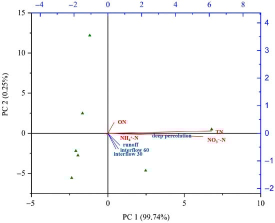 Redundancy analysis (RDA) on the relationships between different forms of N losses and environmental factors was conducted to reveal the impact of hydrological processes on N transport. The result of the RDA revealed that the first and second components axes explained approximately 99.74% and 0.25% of the total variation in N loss, respectively (see Figure 8). RDA results suggest that rainfall and water loss (especially the surface runoff) are the main factors affecting the stratified transport of N.